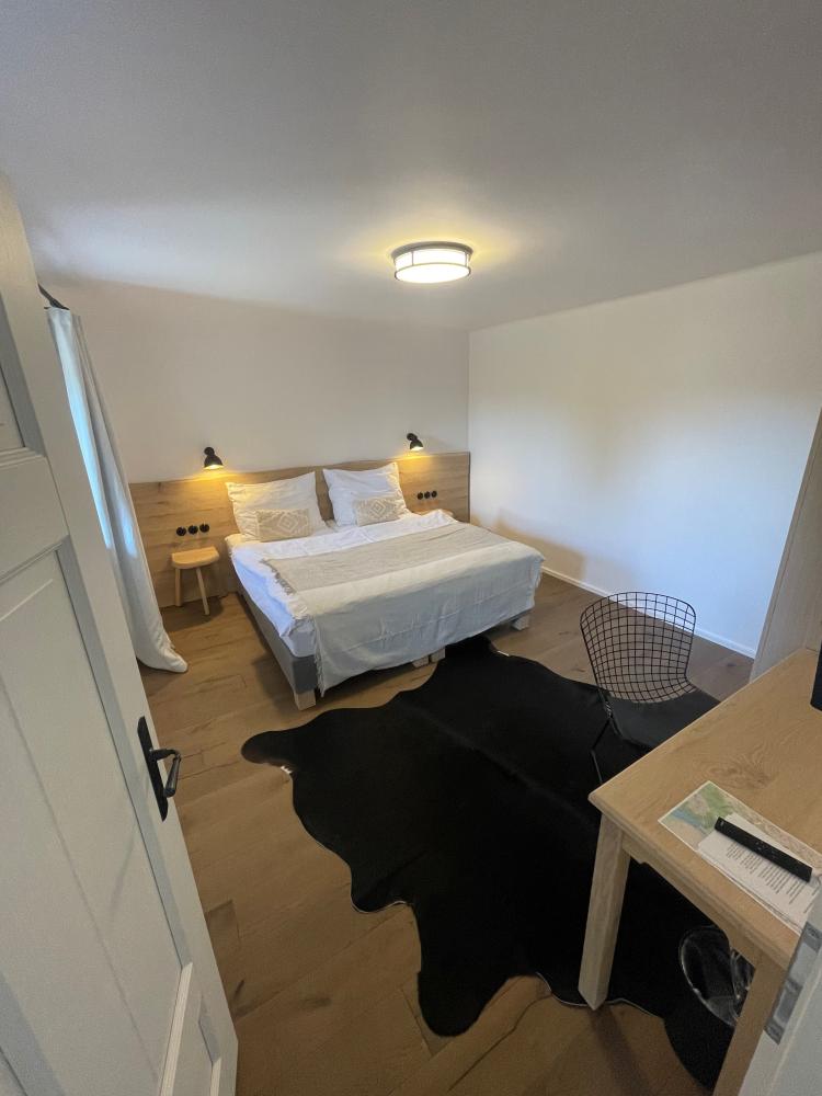 Dvoulůžkové pokoje s interiérem bílé barvy a světlého dřeva mají výhled na vyhlídku Kára, Kraví horu i na přehradu s řekou Dyji.