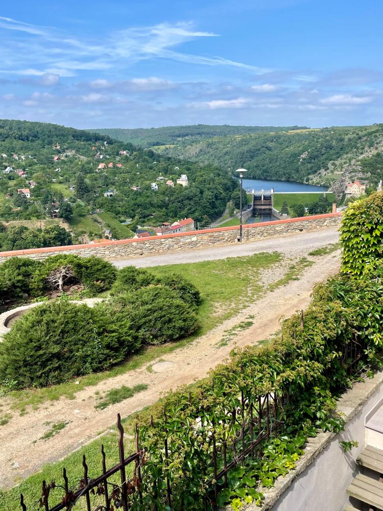 Výhled pokoje je na vyhlídku Kára, Kraví horu i na řeku Dyji a přehradu.